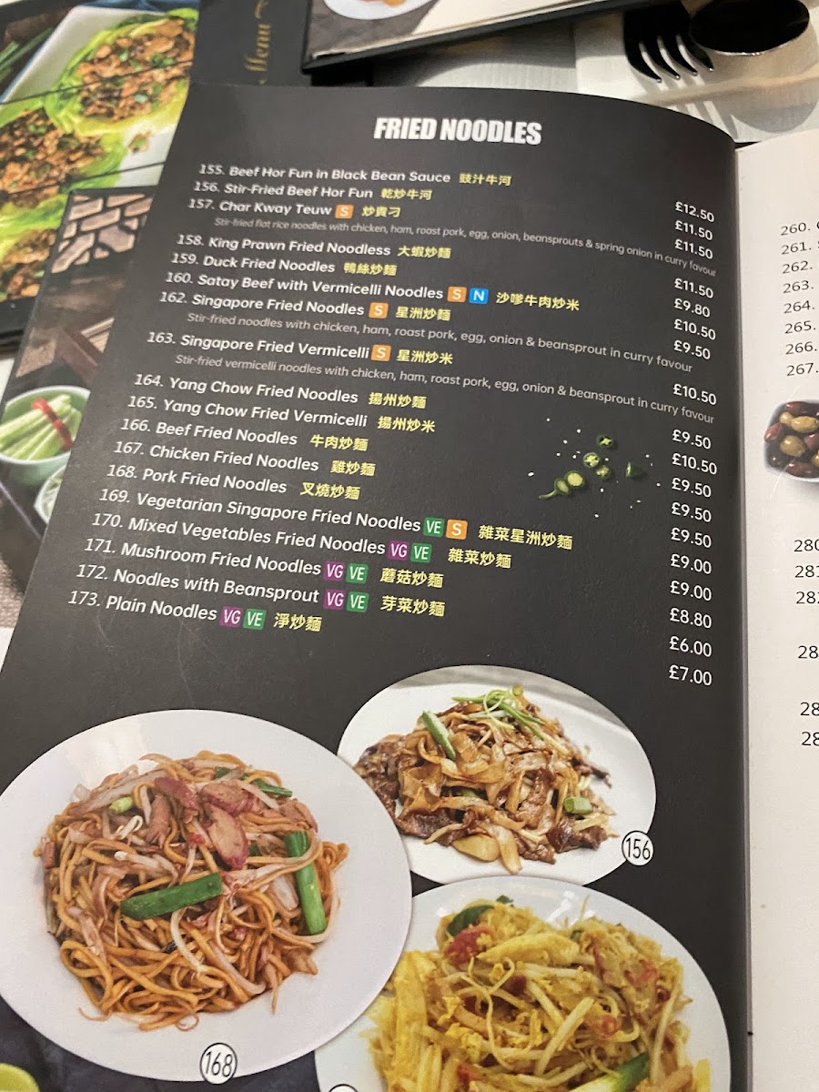 Stir-fried flat rice noodles with chicken, ham, roast pork, egg, onion, beansprouts & spring onion in cury fowo